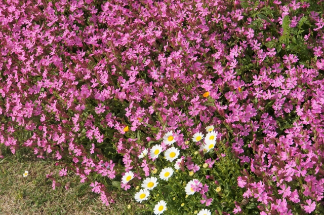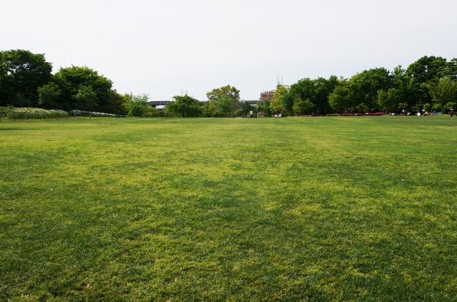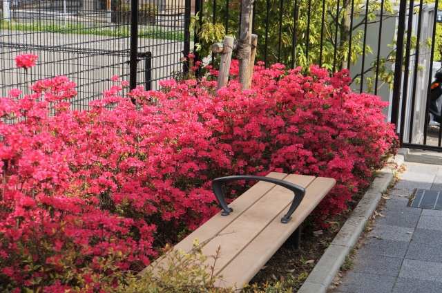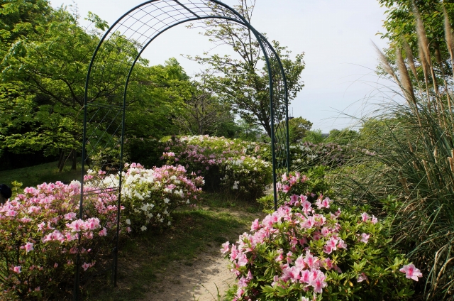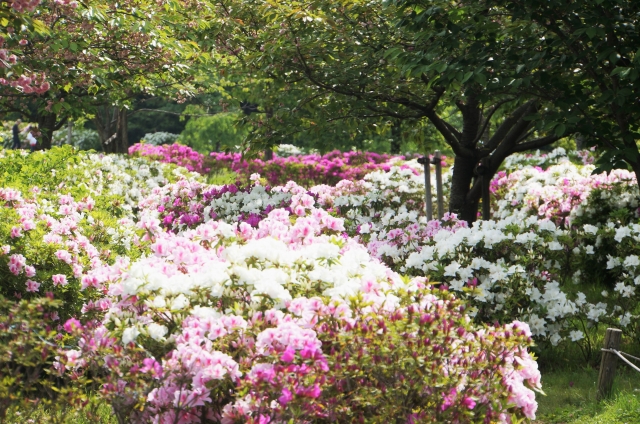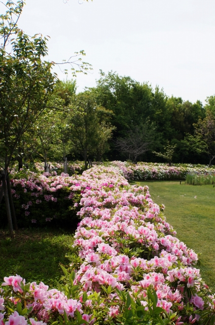 芝生のまわりをぐるっと取り囲むようにツツジが咲き誇っていますよ。