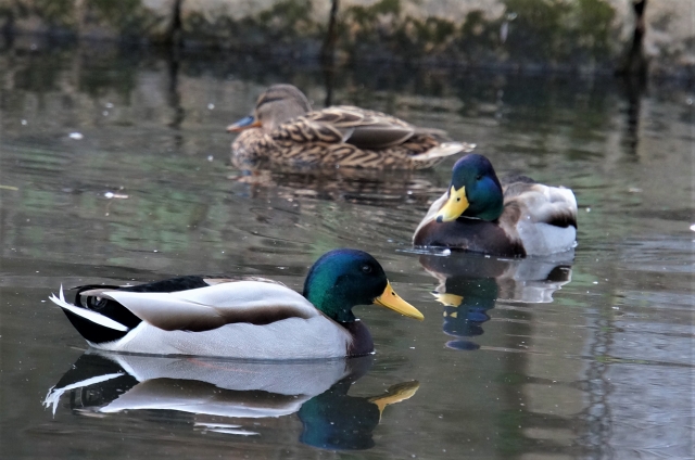 今日は池でカモさんたちが泳いでます。