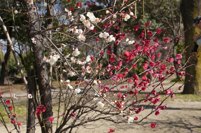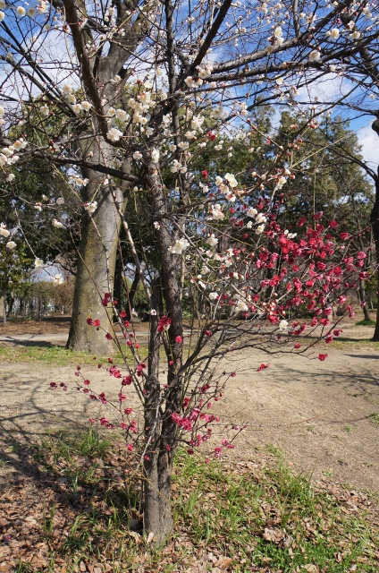 線路に近いところには、赤と白と1本の木から咲き分ける梅もあります。