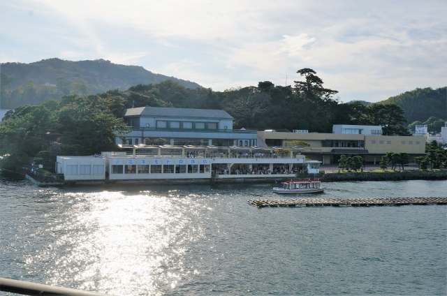 この後、フェリーに乗って宿泊施設に向かう時に真珠島が見えました。