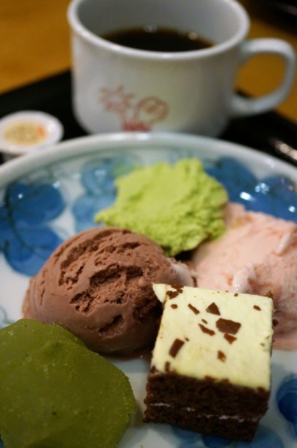 デザートはアイスとプチケーキとわらびもち。
