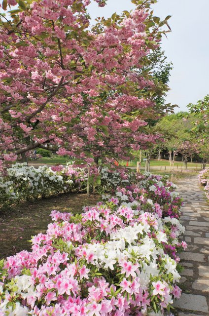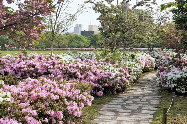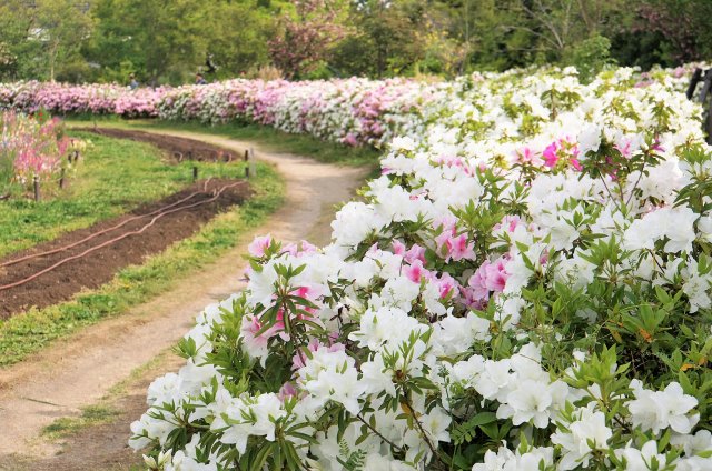 芝生の広場の奥の方に見えているピンク色もツツジですよ。