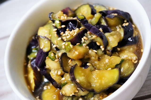 ナス切ってチンして和えただけですよ。