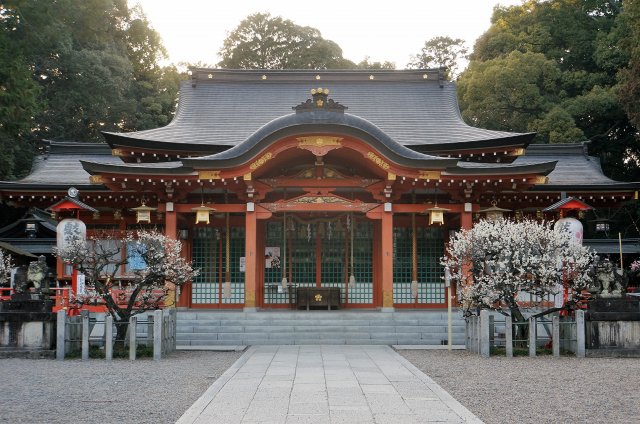 美しい朱色の社殿の前には満開の梅が咲き誇っていますよ。