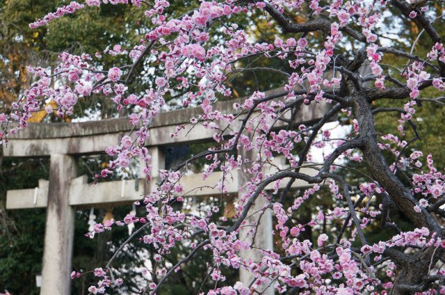 ピンクの梅は社殿の少し手前にあります。