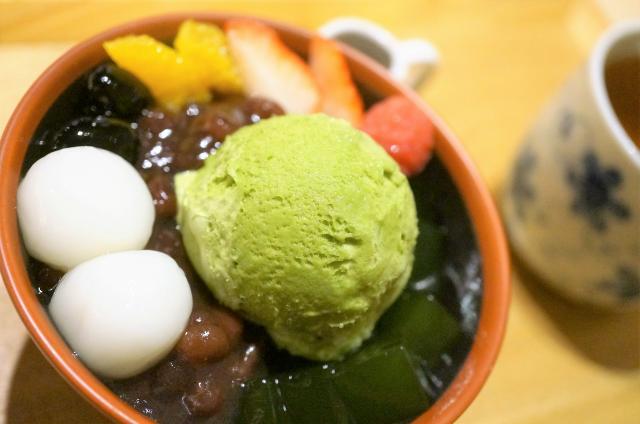私は抹茶アイス食べたくて、あんみつ頼みました。
