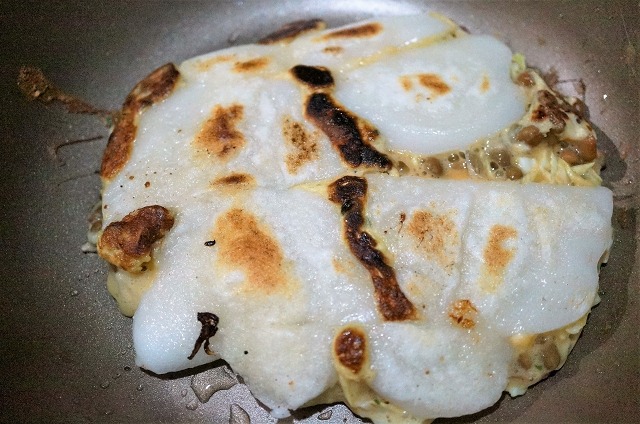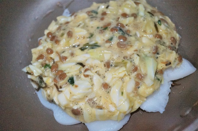 膨らんできたら、納豆1パック、玉子1個、小麦粉大さじ1、あと残り野菜(カットキャベツとか)混ぜ混ぜしたのを乗っけます。