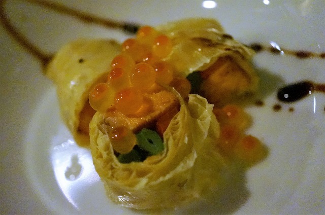 オードブルはシャケと野菜を湯葉で巻いていくらをのっけた一品。