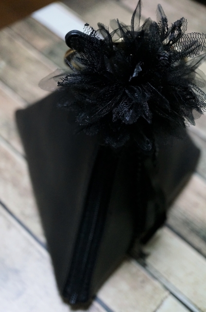 GUで安くなっていたトライアングルなバッグに黒のコサージュつけてみた。