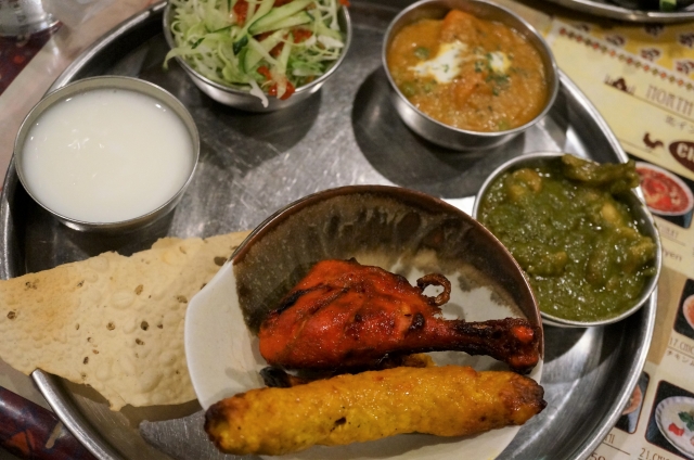 メニューは色々あるのですが、タンドリーチキンやチキンシークカバブ、カレーも2種類楽しめるセセットにしました。