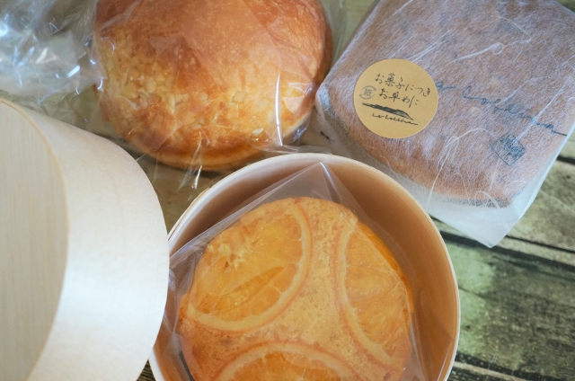 オレンジケーキ(中央)と焼き立て八幡カステラ(右上)にクーゲルバーム(左上)。